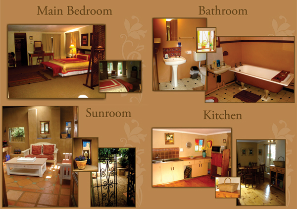 Our Open-plan Cottage features an entrance hall opening onto the Main Bedroom with its queen-size bed, DSTV and en-suite bathroom. An adjoining bedroom with 2 single beds leads off the main bedroom. The en-suite bathroom is equipped with both bath and shower and two toilets. A small kitchen with modest dining area leads into cosy sunroom with